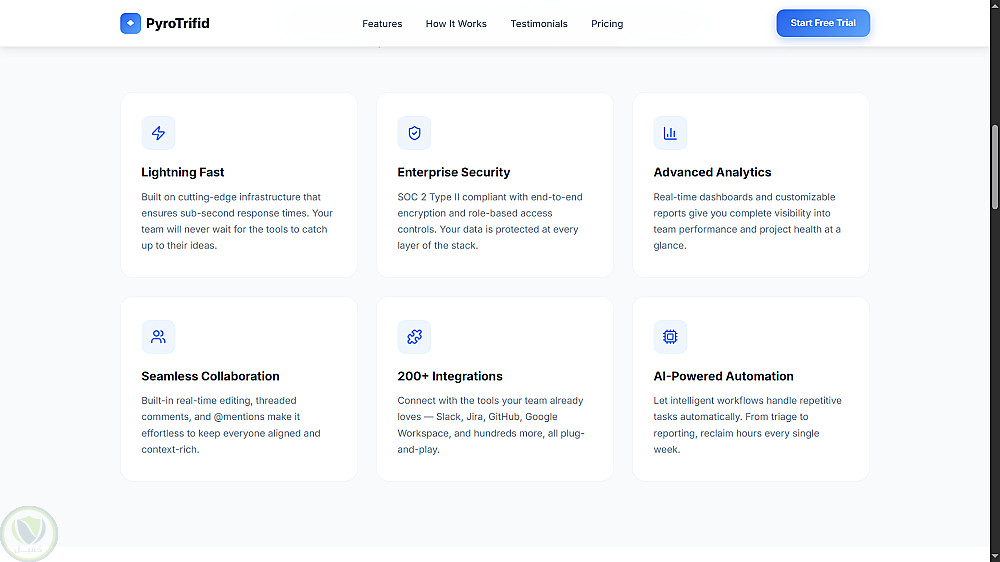 شبكة الميزات: استعراض 6 قدرات أساسية (كالسرعة، الأمان، الأتمتة، والتحليلات) بأيقونات واضحة.