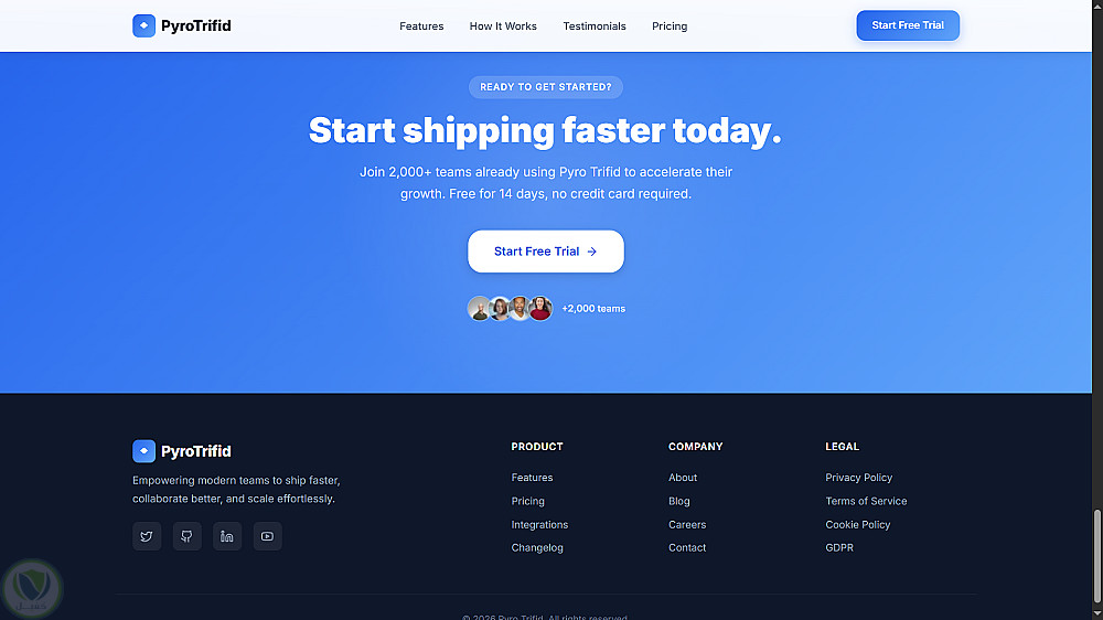 النداء الأخير والفوتر: شريط سفلي أزرق بارز كدفعة أخيرة لتشجيع التسجيل، يليه تذييل قياسي بمعلومات الشركة وروابطها.