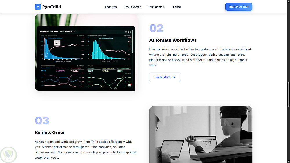 القسم الرئيسي: عنوان جذاب يركز على الفوائد، وأزرار للحث على اتخاذ إجراء (تجربة مجانية وعرض توضيحي).