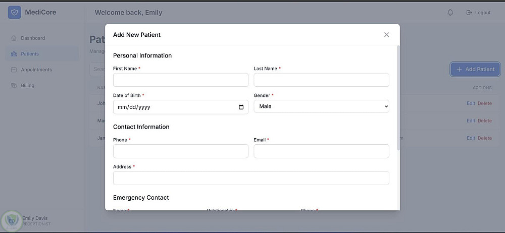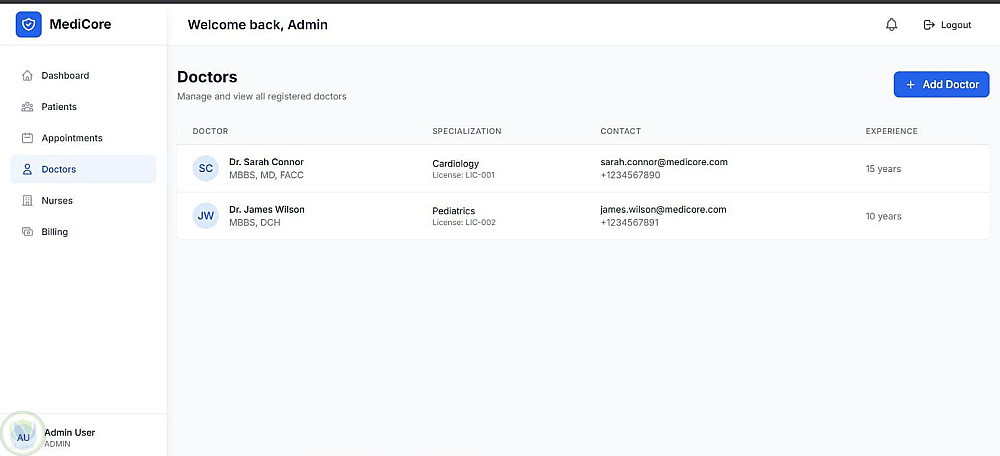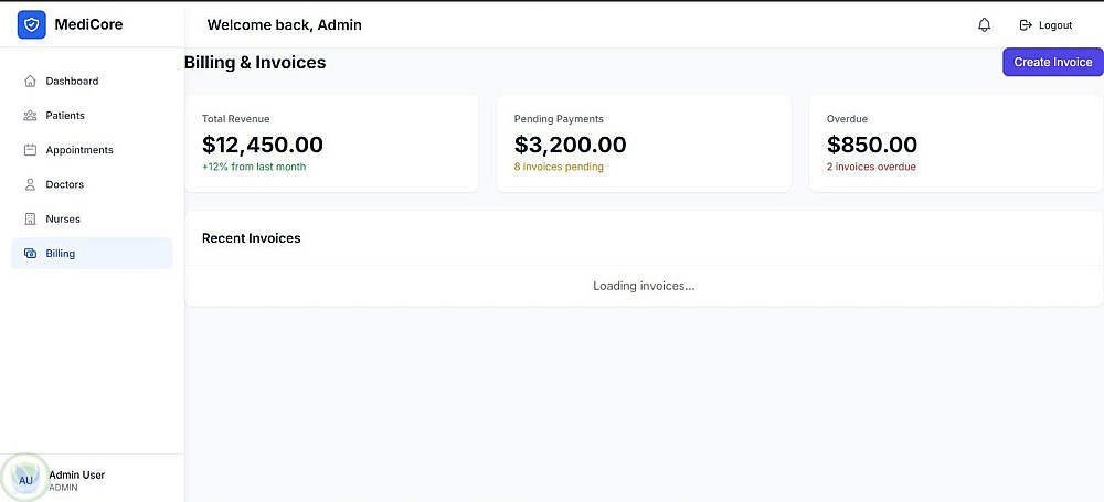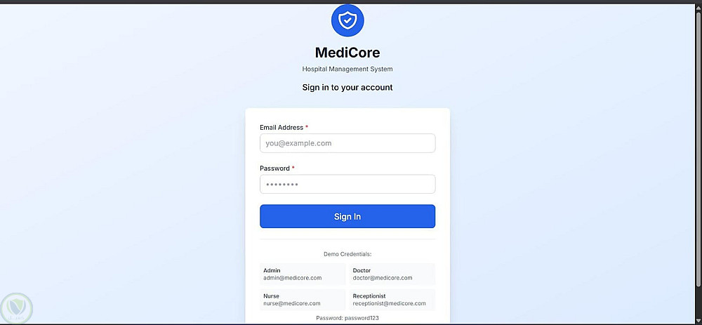 قمت بتصميم وتطوير نظام إدارة مستشفى كامل (MediCore) يتيح إدارة المرضى، المواعيد، الأطباء، الفواتير والتقارير بشكل مركزي وسلس.