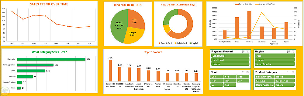 كما يحتوي الداشبورد على 4 فلاتر تفاعلية (Slicers) لتصفية البيانات حسب طريقة الدفع، المنطقة، الشهر، وفئة المنتج.