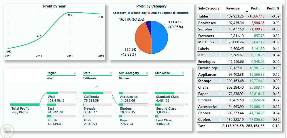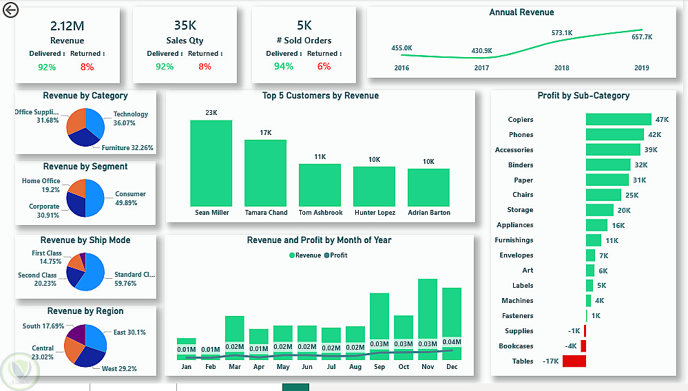 تعرض ملخص أداء المبيعات من خلال بطاقات KPI للإيرادات وكمية المبيعات وعدد الطلبات، مع مخططات توضح توزيع الإيرادات حسب الفئة والشريحة وطريقة الشحن والمنطقة، بالإضافة إلى تحليل أفضل العملاء والأرباح حسب الفئات الفرعية ومقارنة الإيرادات والأرباح عبر الأشهر.