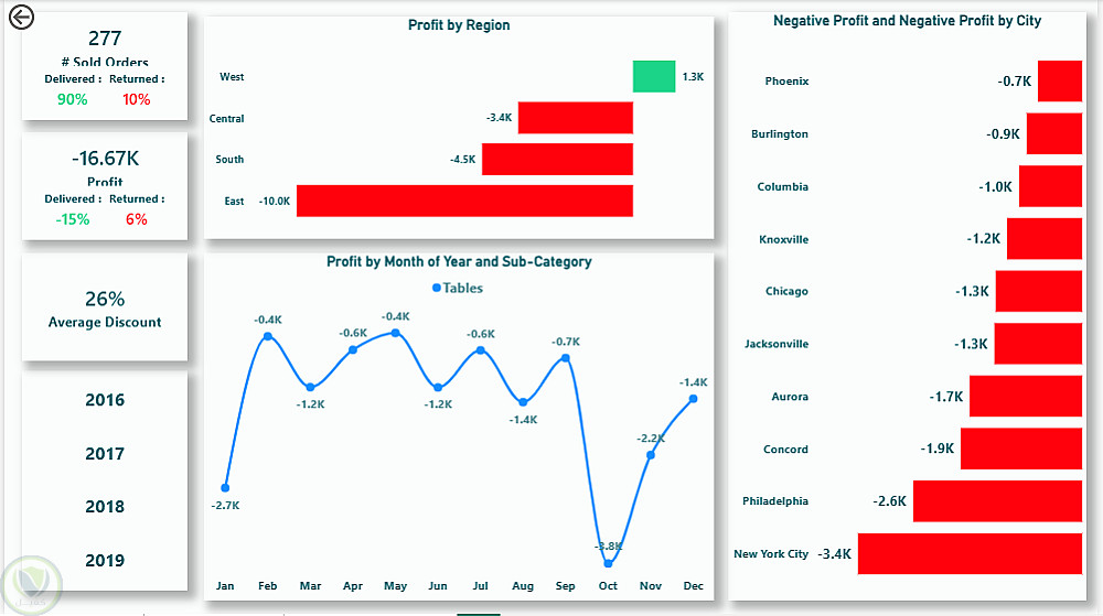 يتضمن المشروع تحليل بيانات المبيعات وبناء Dashboard تفاعلي باستخدام Power BI لعرض مؤشرات الأداء واكتشاف فرص زيادة الأرباح وتحديد مصادر الخسائر.