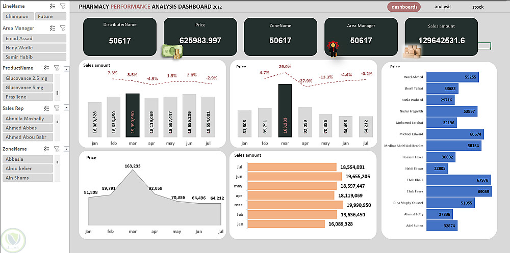 "صممت لوحة البيانات دي عشان تتابع أداء الصيدليات بشكل لحظي وسهل. الداشبورد بتعرض مؤشرات الأداء الأساسية (KPIs) زي إجمالي المبيعات، الأسعار، وتوزيع المناديب والمناطق."