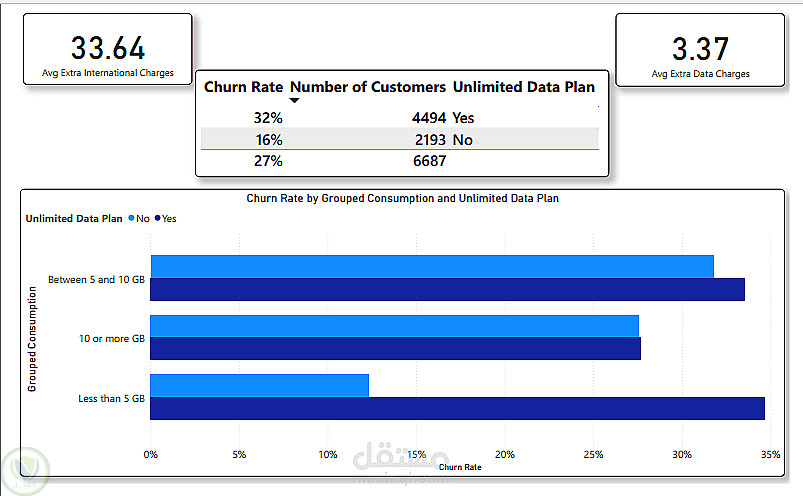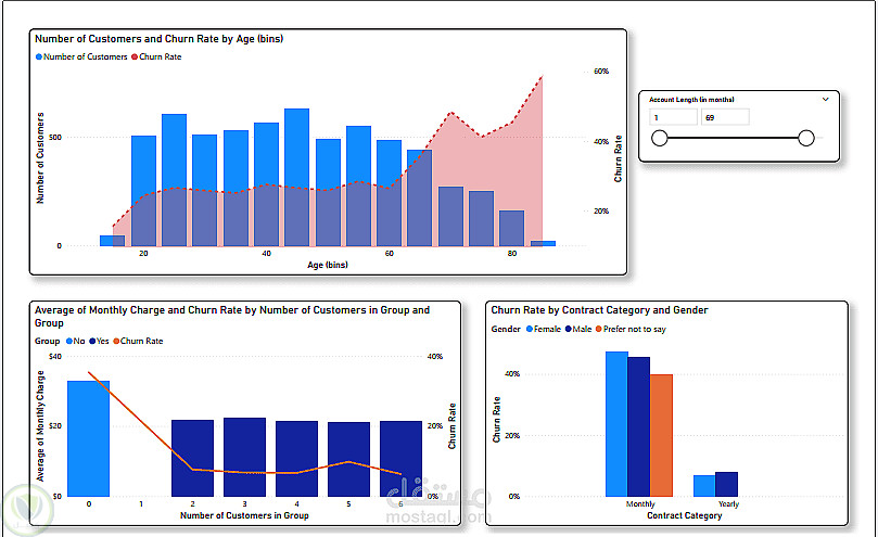 معدل فقدان العملاء حوالي 27%. العملاء بعقود شهرية لديهم معدل فقدان مرتفع 46% مقارنة بالعقود السنوية 7%. أبرز الأسباب: عروض المنافسين، ارتفاع الأسعار، وعدم الرضا عن الخدمة. كما أن مشتركي البيانات غير المحدودة أو المكالمات الدولية لديهم معدل فقدان أعلى.