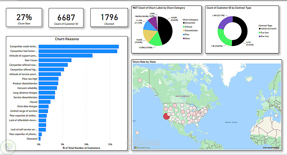 يحلل المشروع بيانات عملاء شركة اتصالات لتحديد العملاء الأكثر عرضة لإلغاء الاشتراك (Churn) ومعرفة الأسباب الرئيسية لذلك، بهدف تقديم توصيات تساعد على تقليل فقدان العملاء وتحسين الأداء.
