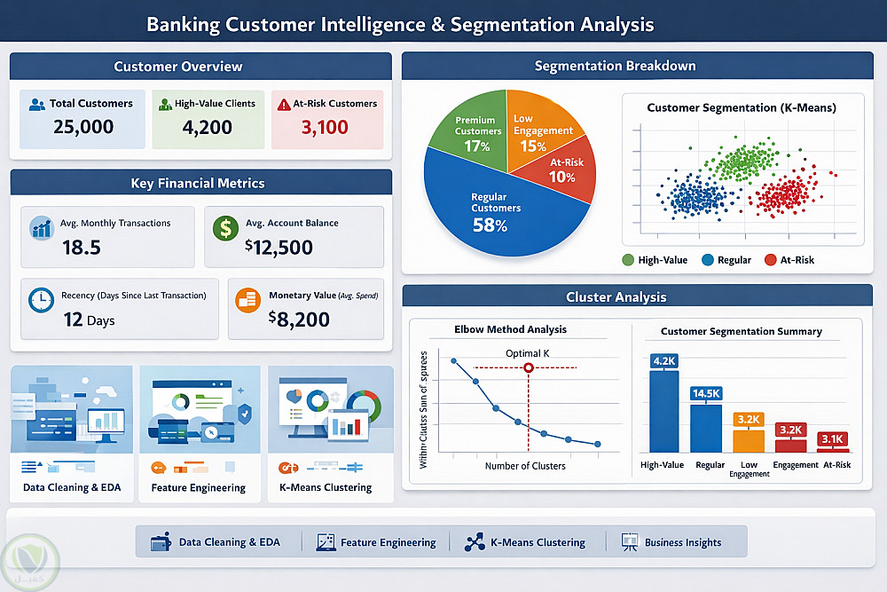 يهدف المشروع إلى تحليل بيانات معاملات العملاء البنكية بهدف فهم الأنماط المالية المختلفة للعملاء وتصنيفهم إلى مجموعات سلوكية تساعد في دعم اتخاذ القرار داخل المؤسسات المالية.