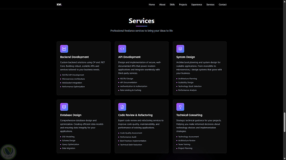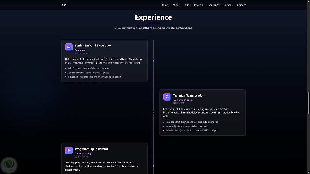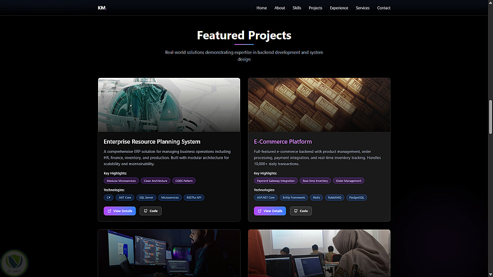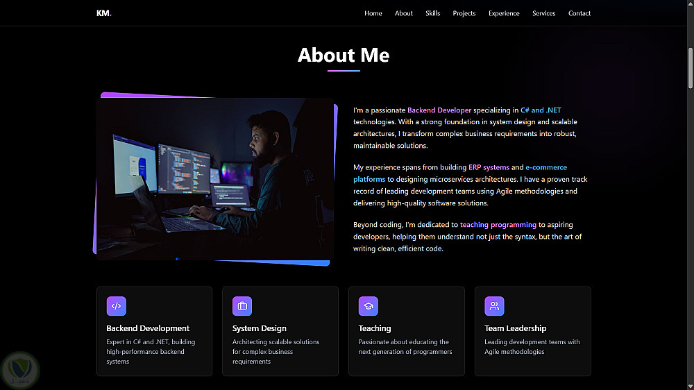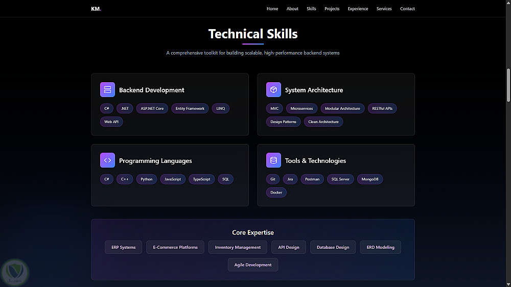 الموقع يعرض المهارات البرمجية والخبرات والمشاريع بطريقة منظمة تساعد أصحاب الأعمال والعملاء على التعرف على قدرات المطور بسهولة.