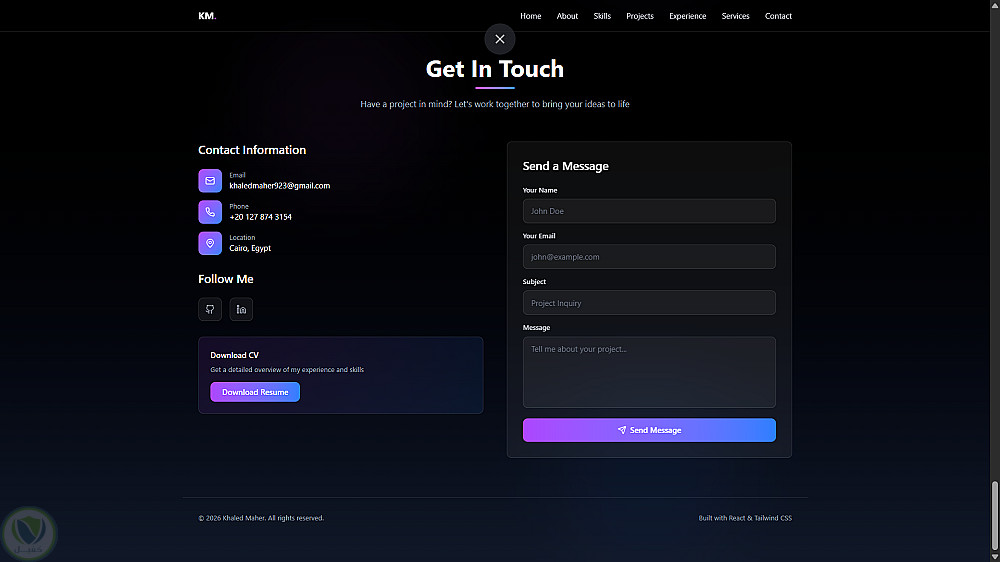 قمت بتصميم وتطوير موقع Portfolio احترافي لمطور برمجيات بهدف عرض المهارات التقنية والمشاريع بشكل احترافي يساعد على بناء الهوية المهنية وجذب العملاء.