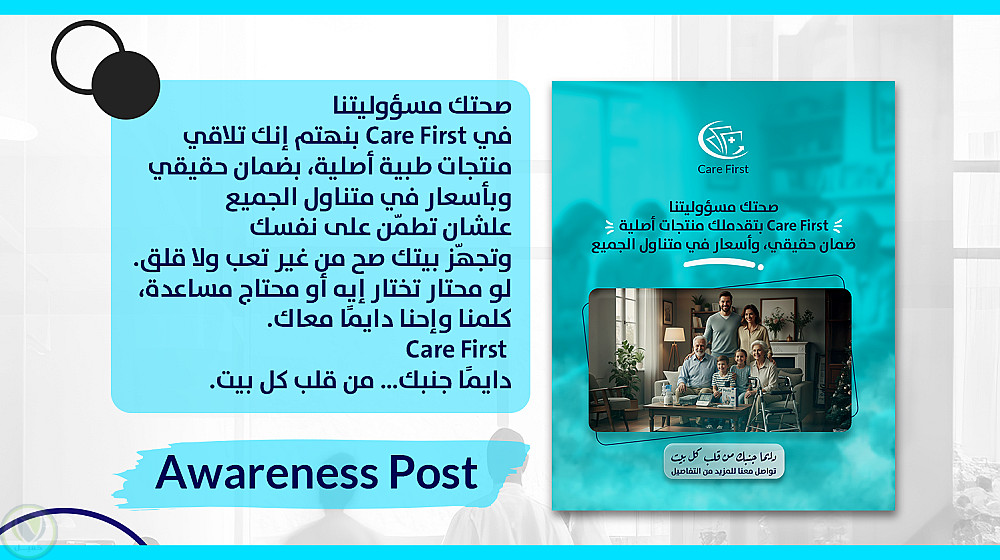 قمت بكتابة محتوى تسويقي لصفحات السوشيال ميديا الخاصة ببراند Care First المتخصص في المنتجات والمستلزمات الطبية، مع التركيز على تقديم محتوى واضح ومفيد يعزز ثقة الجمهور ويزيد من التفاعل.