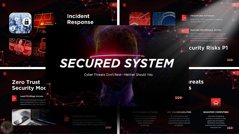 عرض تقديمي عن موقع إلكتروني مؤمن بتصميم عصري داكن ومعلومات حقيقية.