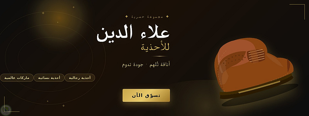 تصميم بانر إعلاني رقمي بأسلوب فاخر وشرقي الطابع لمحل أحذية، يعتمد على لوحة ألوان داكنة من الأسود والبني الدافئ مع لمسات ذهبية متناسقة تعكس الفخامة والأناقة. يتضمن التصميم رسمة حذاء رجالي كلاسيكي بتفاصيل دقيقة كالـ Brogue والربطة الذهبية، محاطاً بزخارف هندسية شرقية من دوائر وخطوط رفيعة. تم توظيف التايبوغرافي العربي الأصيل بخطوط Amiri وCairo لإبراز هوية العلامة، مع شعار تسويقي "أناقة تُلهم · جودة تدوم". المقاس: 1200×450 بكسل.