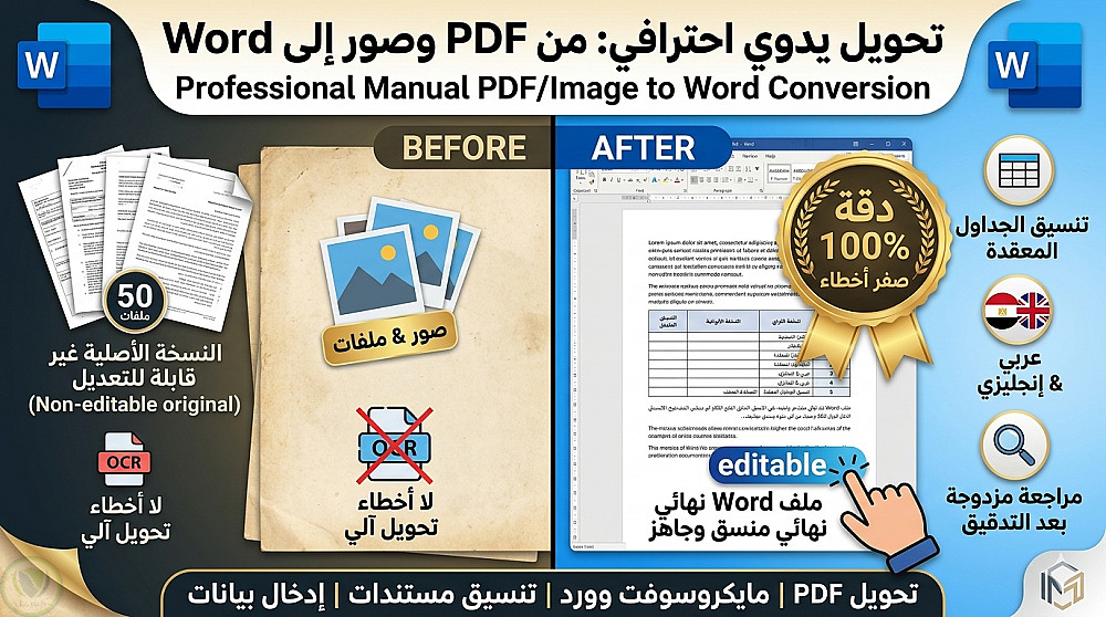 تحويل يدوي لـ 50 صورة وملفات PDF إلى Word (تنسيق مطابق ودقة 100%)