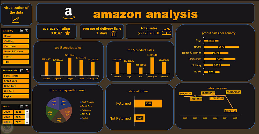 في هذا المشروع قمت بتحليل بيانات مبيعات خاصة بمنصة Amazon بهدف فهم أنماط المبيعات والعوامل التي تؤثر على أداء المنتجات. تم تنفيذ التحليل باستخدام Microsoft Excel من خلال تنظيم البيانات، تنظيفها، ثم إجراء التحليلات المختلفة لاستخراج معلومات مفيدة من البيانات.