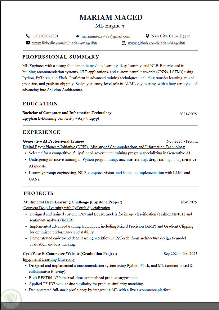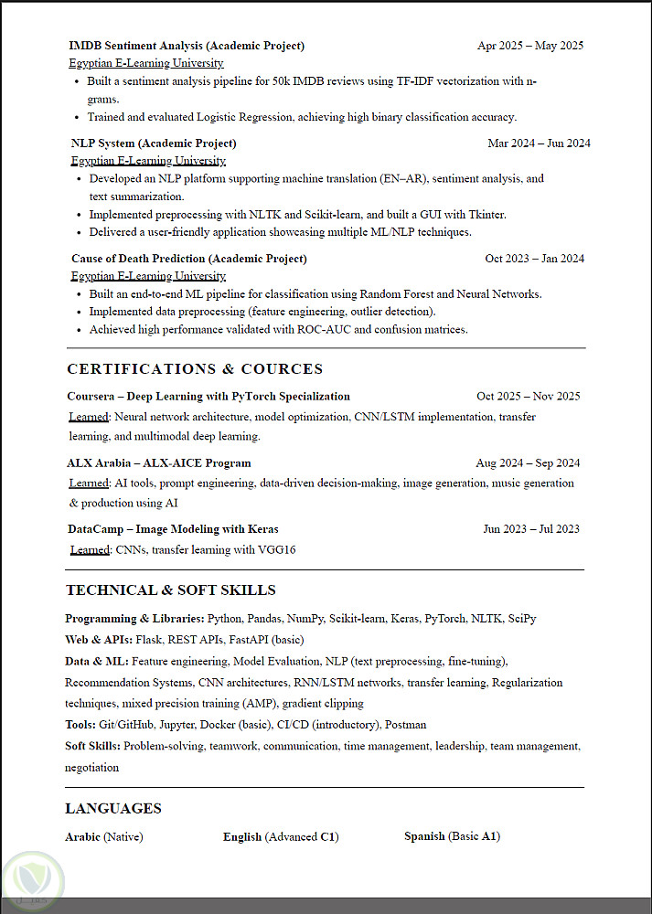 - الصياغة المبنية على الإنجاز: لم أكتفِ بذكر الأدوات، بل ركزت على "النتائج" والتقنيات المتقدمة المستخدمة مثل (Mixed Precision) و (Gradient Clipping) و (Fine-tuning)، مما يعطي انطباعاً فورياً بالاحترافية والتعمق التقني.