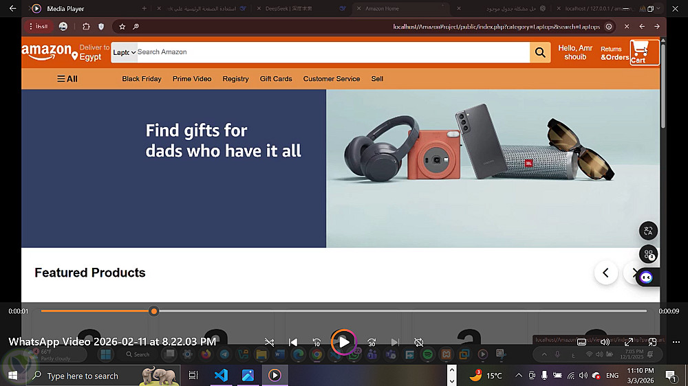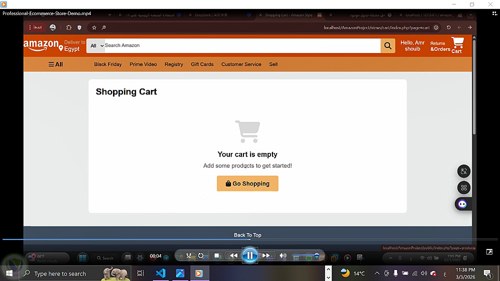 موقع تجارة إلكترونية شبيه بأمازون يتيح عرض المنتجات، صفحة تفاصيل لكل منتج، إضافة المنتجات إلى سلة المشتريات، وتصميم متجاوب يعمل على الموبايل والكمبيوتر. تم تنفيذ المشروع باستخدام تقنيات الويب الأساسية مع واجهة مستخدم بسيطة وسهلة الاستخدام.