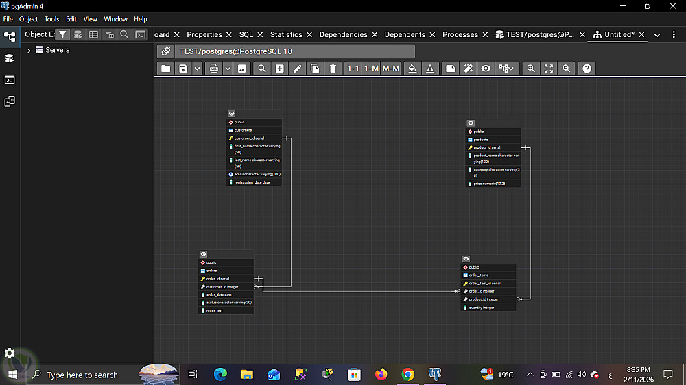 مشروع قواعد بيانات بسيط لإدارة العملاء والطلبات باستخدام PostgreSQL، يتضمن إنشاء الجداول، وكتابة استعلامات ودوال لعرض الطلبات المسلّمة وترتيبها حسب اسم العميل.