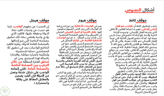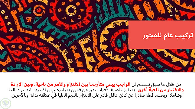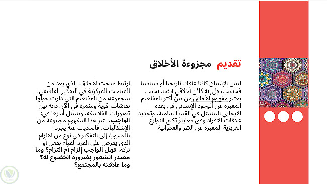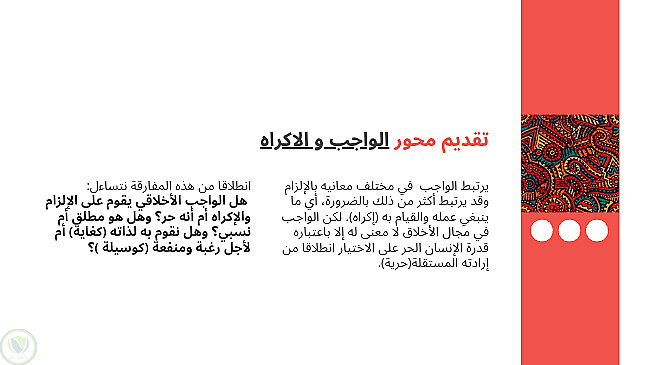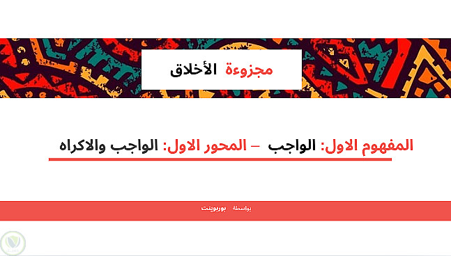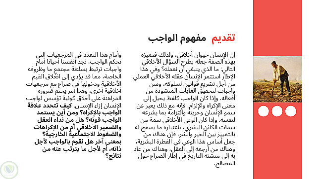 عرض تقديمي باللغة العربية لمجزوءة الأخلاق، المحور الاول الواجب والإكراه، مفهومه الواجب في مادة الفلسفة لأصحاب الثانية بكالوريا، مع الأخذ بعين الإعتبار أن المقال من مجهودي الخاص.