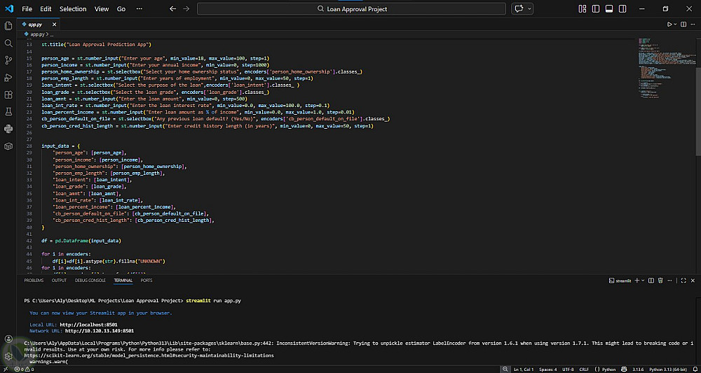 تطبيق ويب (Deployment): تحويل النموذج النهائي إلى تطبيق تفاعلي باستخدام Streamlit، يتيح للمستخدم إدخال بياناته وعرض نتيجة أهليته للقرض (مقبول/مرفوض) فوراً.