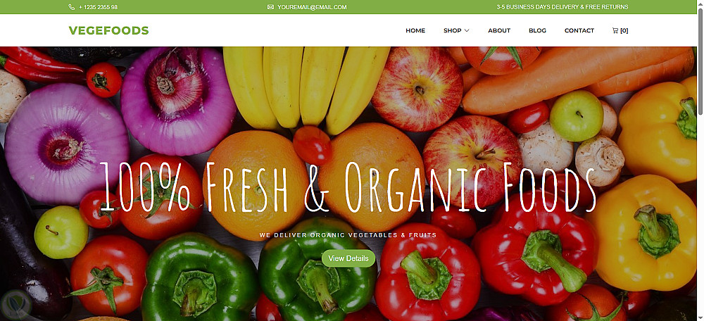 صفحة ويب بسيطة لمتجر يبيع الخضروات والفواكه الطبيعية. الصفحة عبارة عن Landing Page تعرض فكرة المتجر بشكل واضح، مع قسم رئيسي يحتوي على صورة للمنتجات وزر للتفاعل، بالإضافة إلى شريط تنقل للأقسام المختلفة