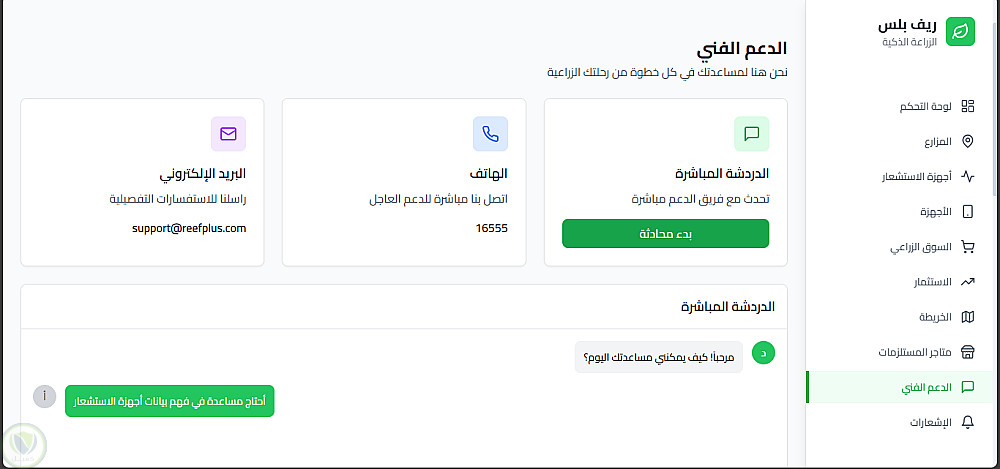 ريف بلس (Reef Plus) هي منصة زراعية ذكية (Agri-Tech SaaS) تعمل كحلقة وصل بين الأرض والتكنولوجيا. المنصة تستقبل البيانات اللحظية من حساسات إنترنت الأشياء (IoT) الموجودة في الحقول، وتقوم بمعالجتها وتحليلها لتعرض للمزارعين ومديري المزارع تقارير دقيقة وقرارات ذكية عبر لوحة تحكم بسيطة، والهدف النهائي هو تحسين إنتاجية المحاصيل وتقليل إهدار الموارد.