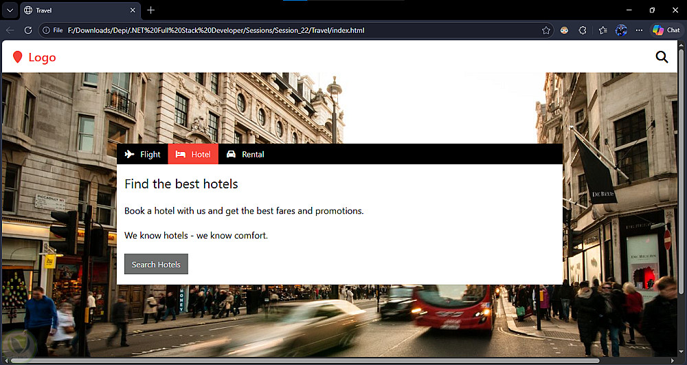 تطوير واجهة مستخدم أمامية (Front-End) مبدئية لمحرك بحث خاص بحجوزات الطيران والفنادق. تم تصميم الهيكل الأساسي باستخدام HTML5 و CSS3 لإنشاء واجهة نظيفة وبسيطة.