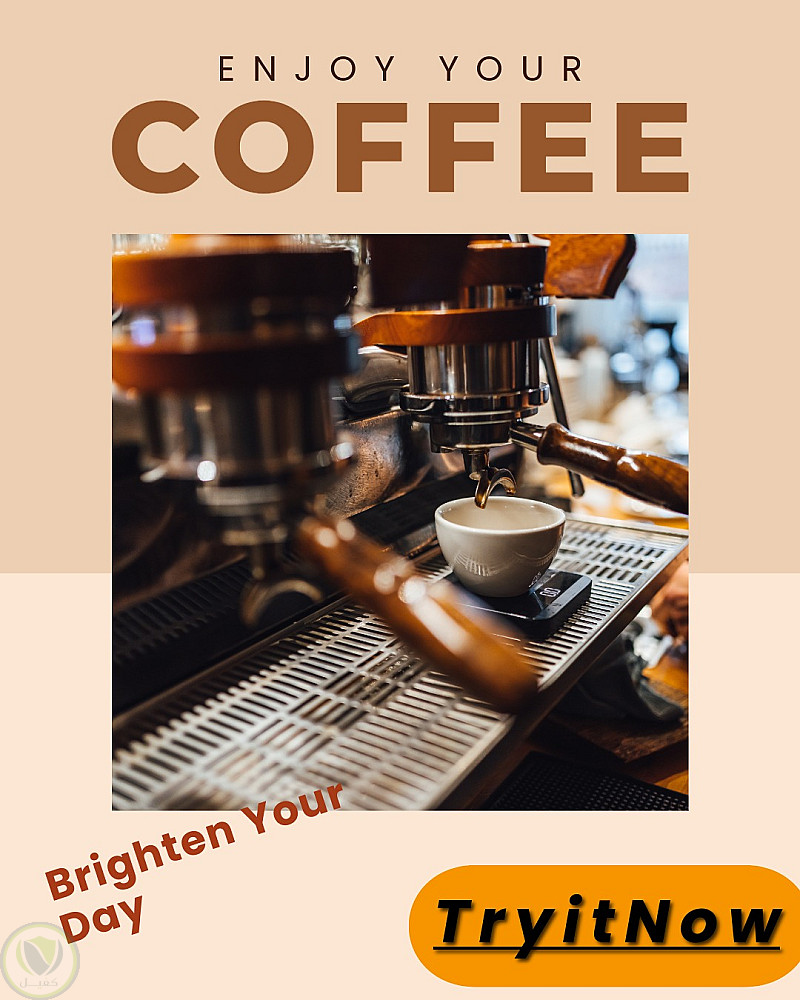 بوستر دعائي باستخدام برنامج Photoshop، يركز على إبراز ماكينة تحضير القهوة أثناء عملية الاستخلاص، مع نصوص تسويقية محفزة مثل 'Enjoy Your Coffee' و 'Brighten Your Day' لزيادة جاذبية المنتج وتشجيع الجمهور على تجربته