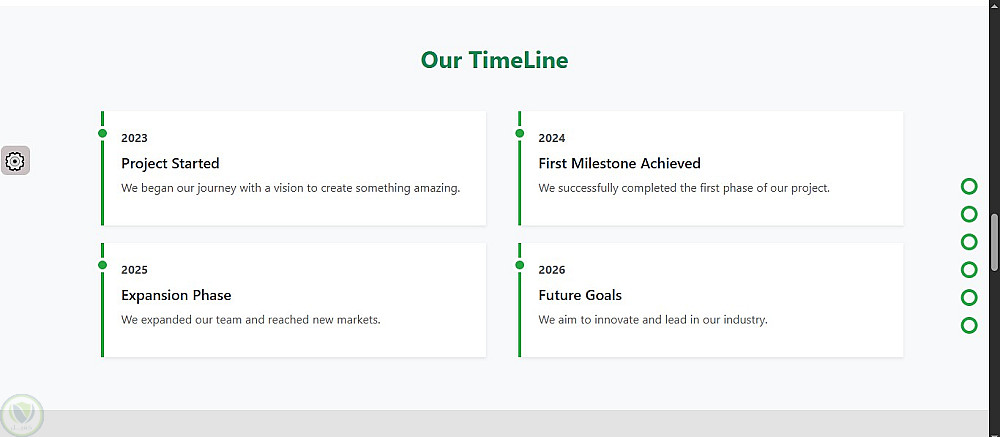 سرد بصري لرحلة الشركة: قسم تفاعلي يعرض "Our Timeline" باستخدام بطاقات (Cards) منظمة تعرض محطات التطور السنوي (2023-2026)، مع تصميم نظيف وأيقونات تفاعلية جانبية.