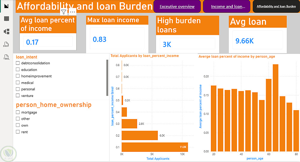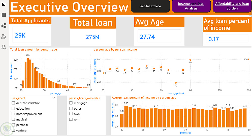 في هذا المشروع، عملت على تحليل بيانات القروض البنكية بهدف فهم أداء القروض ومراقبة المخاطر. استخدمت SQL لاستخراج البيانات وتنظيفها وتجهيزها للتحليل، ثم استخدمت Power BI لإنشاء لوحات معلومات تفاعلية تعرض البيانات بطريقة سهلة الفهم، مثل: