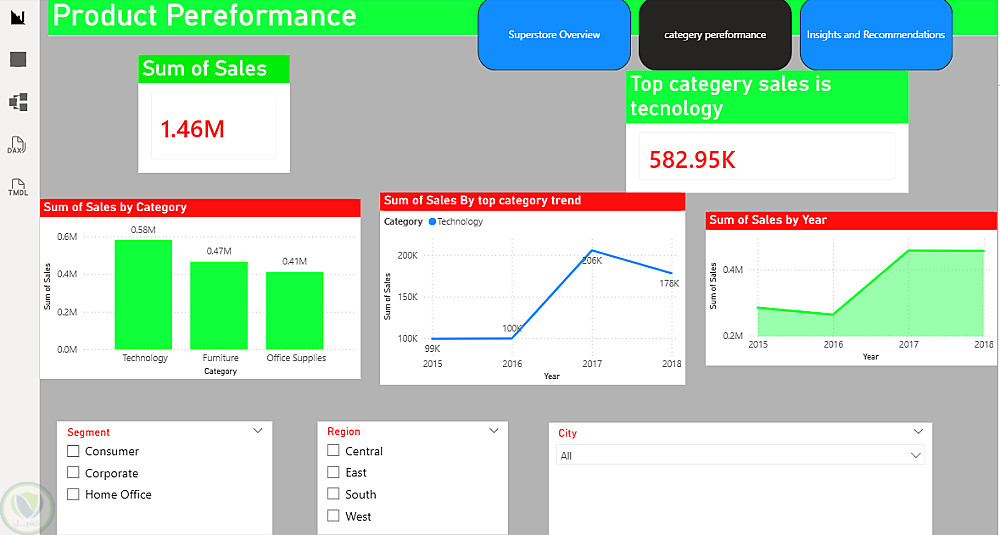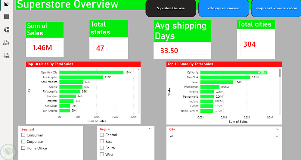 في هذا المشروع، عملت على تحليل بيانات المبيعات لمتاجر Superstore بهدف فهم الأداء التجاري واتخاذ قرارات أفضل. استخدمت SQL لتنظيف البيانات وتجهيزها للتحليل، ثم استخدمت Power BI لإنشاء لوحات معلومات تفاعلية تعرض النتائج بشكل واضح، مثل: