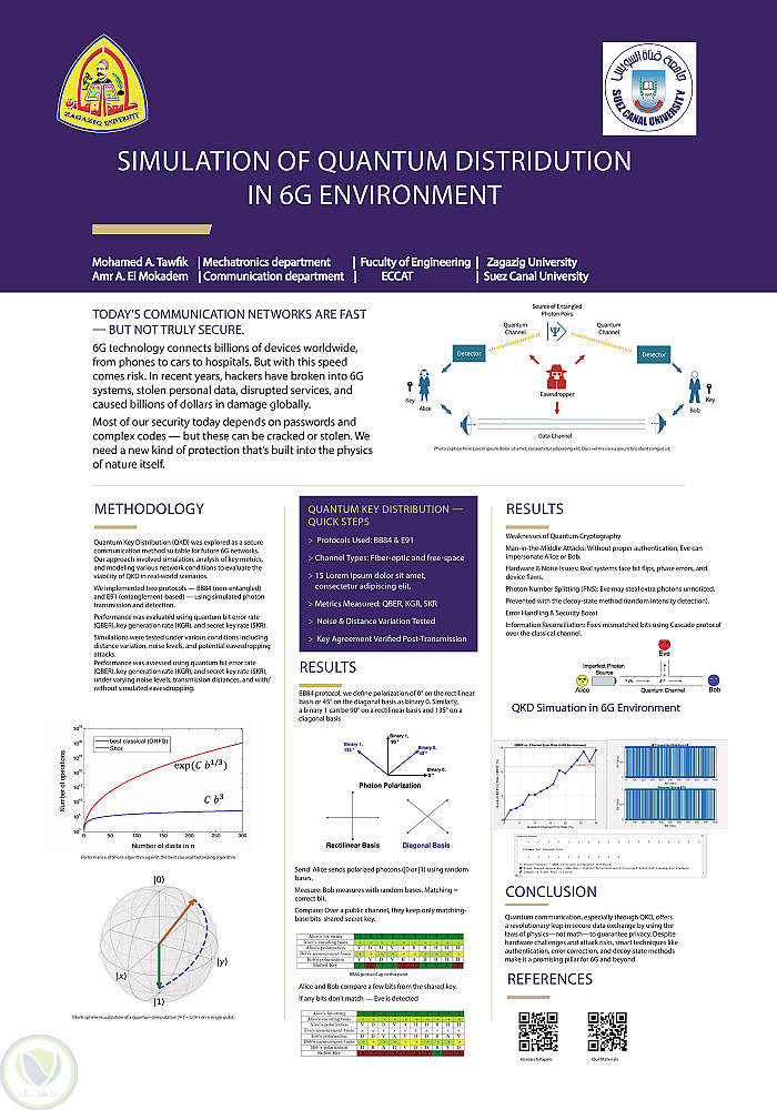 قمت بتصميم وتنسيق بوستر بحثي متكامل لمشروع يتناول محاكاة توزيع المفاتيح الكمومية (QKD) ضمن شبكات الجيل السادس (6G).مميزات العمل: