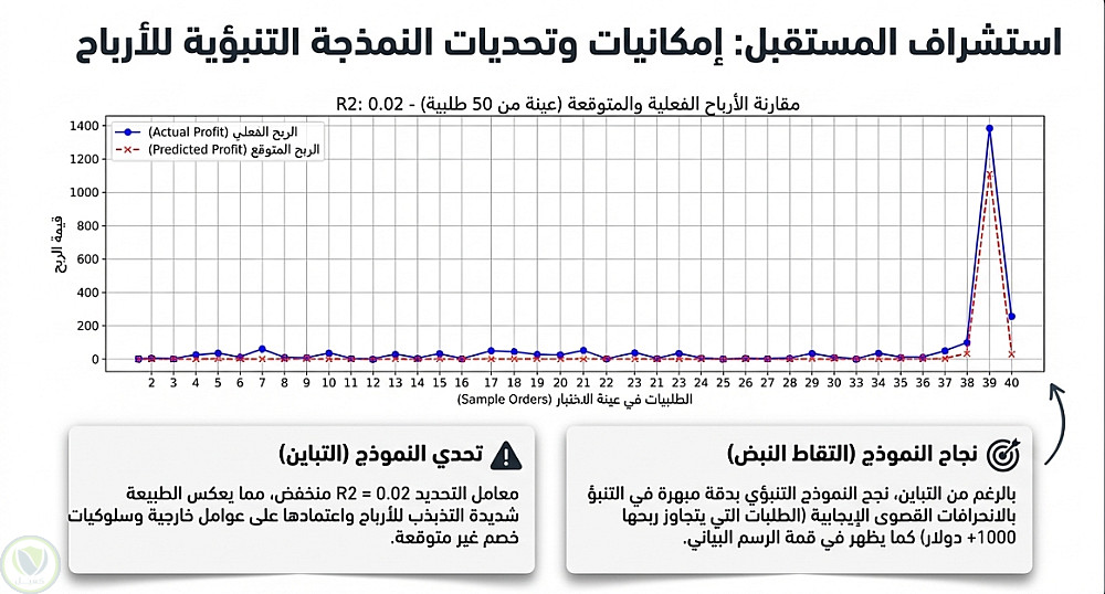 تدريب نموذج (Random Forest Regressor) للتنبؤ بالربح بناءً على ميزات مثل: المبيعات، الخصم، والمنطقة ، وتم رسم مخططات لمقارنة الأرباح الفعلية بالمتوقعة. وقد أظهر النموذج أن حجم المبيعات ثم نسبة الخصم هما الميزتان الأكثر تأثيراً على التنبؤ.