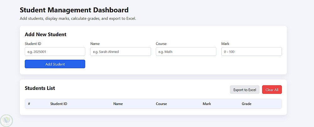 قمت بتطوير لوحة تحكم (Dashboard) متجاوبة لإدارة بيانات الطلاب بشكل احترافي وسهل الاستخدام. يتيح النظام إضافة وتعديل بيانات الطلاب، حساب الدرجات تلقائيًا، وعرض البيانات في جدول منظم مع إمكانية تصديرها إلى ملف Excel.
