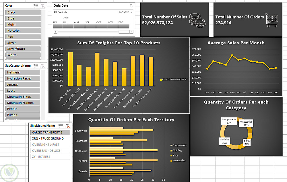 - يقدّم هذا المشروع لوحة تحكم لتحليل المبيعات تم إنشاؤها باستخدام برنامج Excel مع بيانات مأخوذة من قاعدة بيانات AdventureWorks.