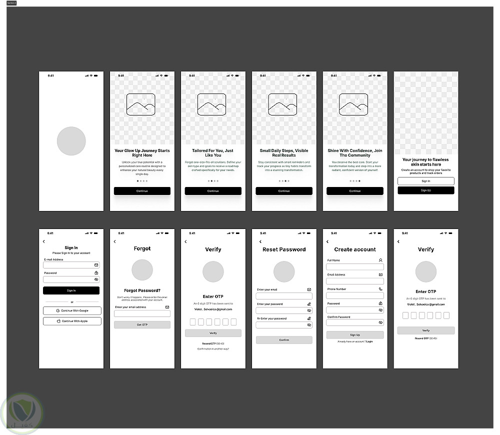 يعرض هذا المشروع المخطط الهيكلي (Wireframe) لتطبيق GlowUp، مع التركيز على المراحل الأولى والحاسمة من تجربة المستخدم، وهي شاشات الترحيب (Onboarding) وعمليات الدخول والتسجيل.