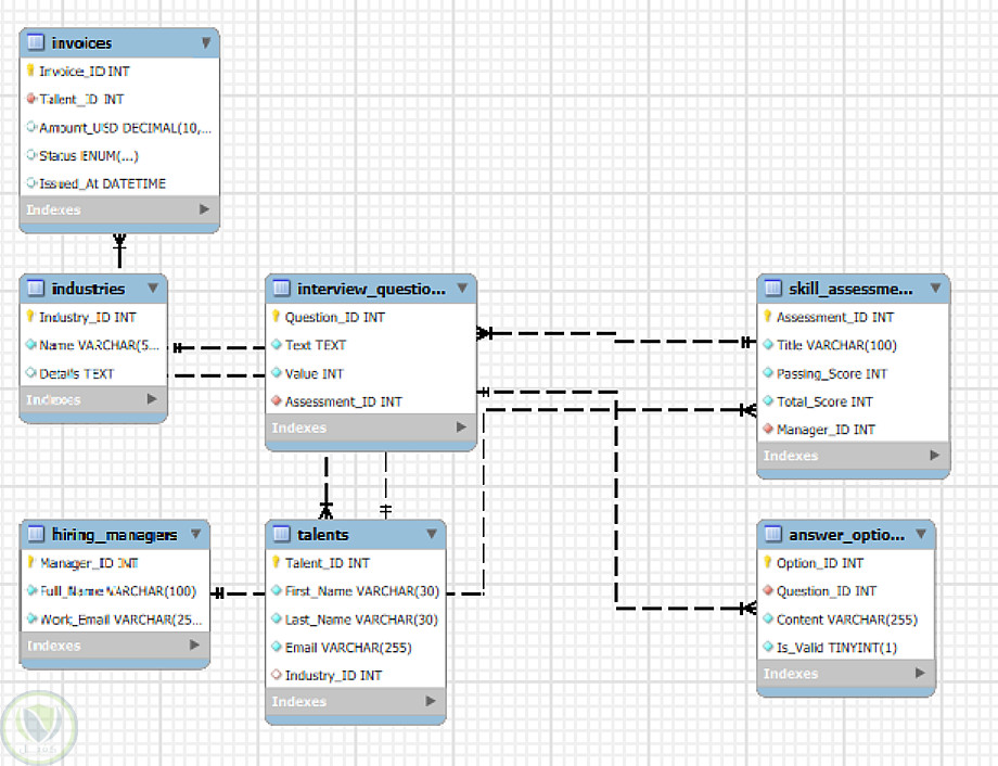 تنظيم تدفق البيانات (Data Flow) بين جداول المتقدمين، التقييمات، والنظام المالي، مما يضمن كفاءة أداء النظام بنسبة 100%."