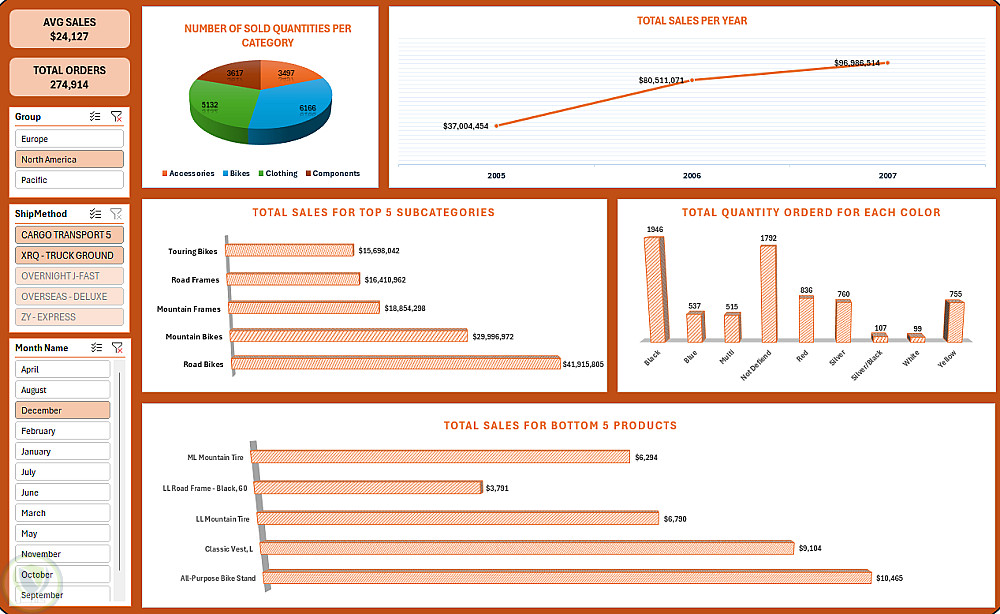 قمت بتطوير مشروع متكامل لتحليل المبيعات عبر بناء نموذج بيانات احترافي لربط جداول الحقائق بالمنتجات، الأقاليم، والتواريخ، مما يضمن دقة وسرعة استخراج المعلومات. تضمن العمل معالجة البيانات الخام باستخدام Pivot Tables وبناء لوحة تحكم تفاعلية تتضمن مؤشرات الأداء الرئيسية (KPIs) مثل متوسط المبيعات (24K$) وإجمالي الطلبات، مع تحليل زمني للمبيعات عبر السنوات، وتصنيف المنتجات حسب الأكثر مبيعاً والأكثر طلباً من حيث اللون والفئة. يوفر المشروع فلاتر متقدمة حسب المنطقة وطريقة الشحن والشهر، مما يمنح أصحاب القرار رؤية ثاقبة لتحديد المنتجات الرابحة وتحسين كفاءة سلاسل الإمداد.