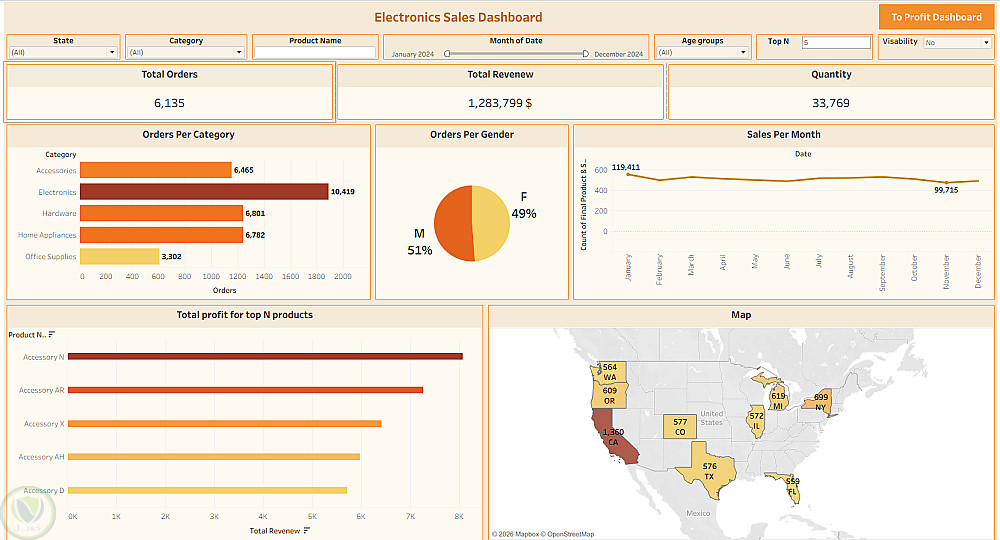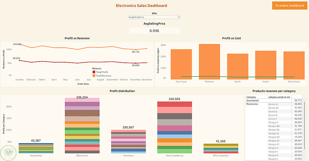 لوحة بيانات تفاعلية لتحليل مبيعات وأرباح الأجهزة الإلكترونية.