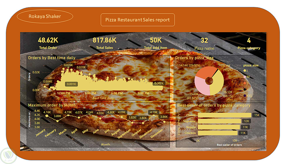 تحويل بيانات مبيعات مطعم بيتزا إلى لوحة تحكم تفاعلية (Sales Report Dashboard) تهدف إلى تحليل سلوك المستهلكين وتحسين العمليات التشغيلية. تم تصميم الداشبورد ليوفر رؤى سريعة ودقيقة حول حجم المبيعات والأوقات الأكثر طلباً، مما يساعد في اتخاذ قرارات مدروسة لزيادة الأرباح.