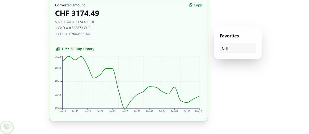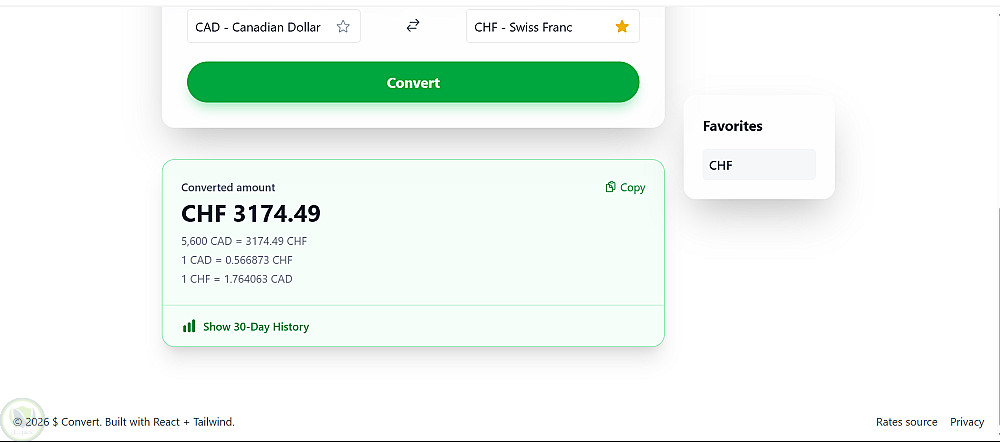 تطبيق حديث ومتكامل لتحويل العملات، مبني باستخدام React وVite وTailwind CSS. يتيح للمستخدمين تحويل المبالغ بين مختلف العملات بسلاسة، واستعراض أسعار الصرف التاريخية، وإدارة العملات المفضّلة، والمزيد — وكل ذلك من خلال واجهة Frankfurter API المجانية.