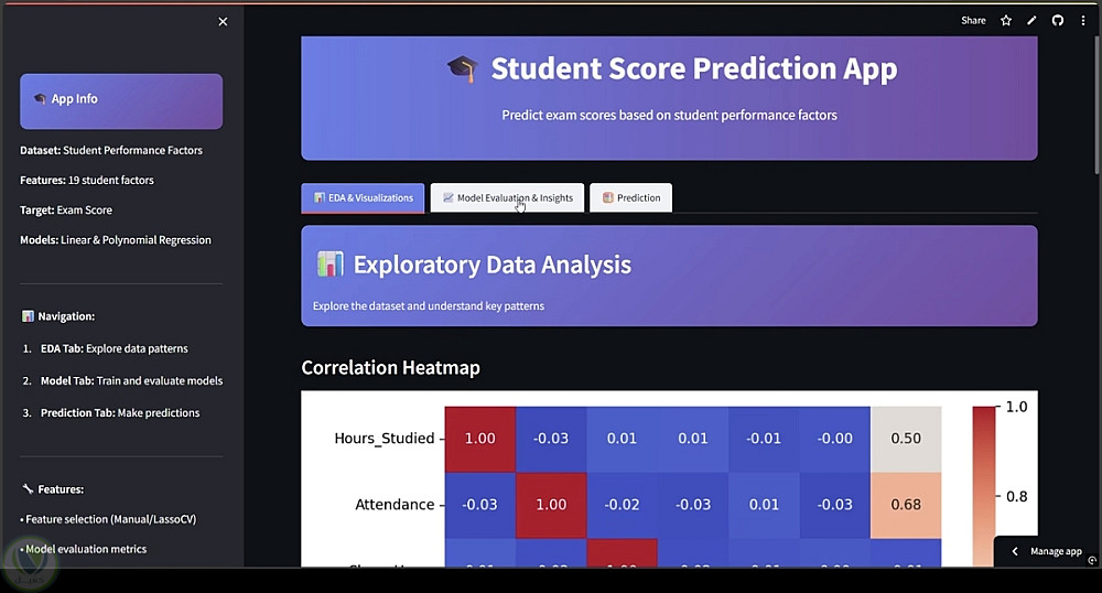 طوير نموذج تنبؤي لتوقع درجات الطلاب بناءً على عوامل مختلفة، مع بناء تطبيق تفاعلي يسمح للمستخدم بإدخال البيانات والحصول على التوقعات فورًا.