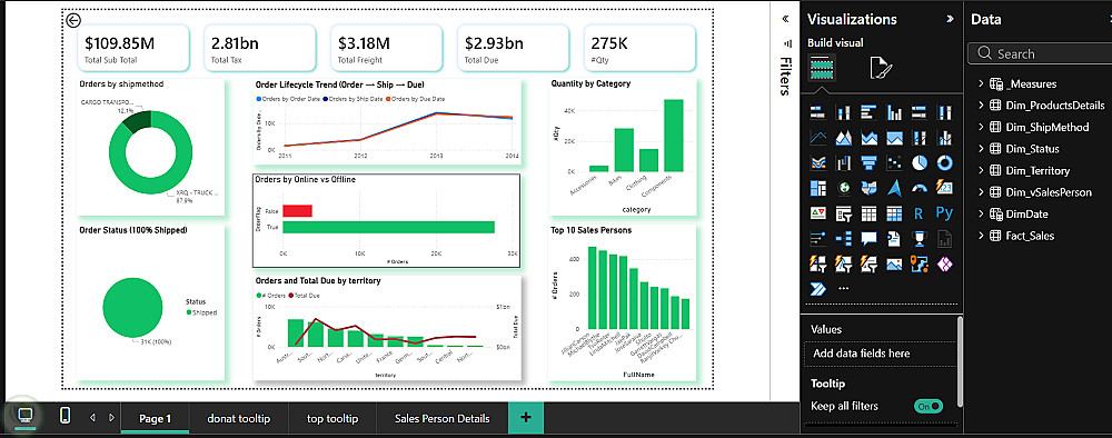 عرض المؤشرات الرئيسية (Total Sales, Tax, Freight, Total Due, Quantity)