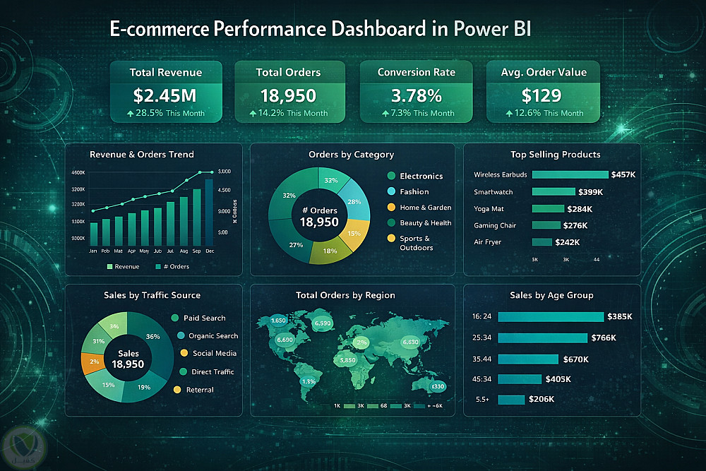 قمت بتصميم( Dashboard )تفاعلية لتحليل أداء التجارة الإلكترونية باستخدام Microsoft Power BI. يعرض التقرير أهم مؤشرات الأداء الرئيسية مثل إجمالي الإيرادات، عدد الطلبات، معدل التحويل، ومتوسط قيمة الطلب. كما يتضمن تحليلات تفصيلية لاتجاهات المبيعات، أفضل المنتجات مبيعًا، توزيع الطلبات حسب الفئات والمناطق الجغرافية، بالإضافة إلى تحليل مصادر الزيارات والفئات العمرية للعملاء. يساعد هذا التحليل في فهم سلوك العملاء وتحسين استراتيجيات التسويق واتخاذ قرارات تجارية مبنية على البيانات.