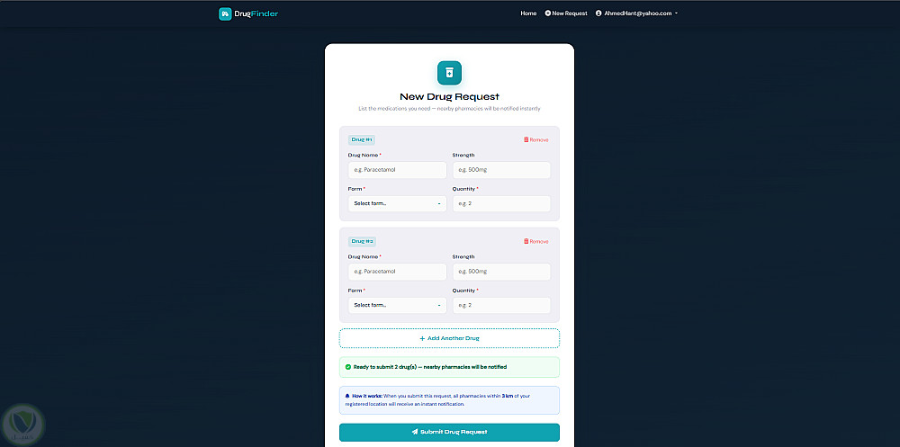 يقوم المستخدم بإدخال الأدوية المطلوبة فقط، ليعمل النظام تلقائيًا على تحديد موقعه وإرسال الطلب إلى مجموعة من الصيدليات القريبة في نفس الوقت. بعد ذلك، تقوم الصيدليات بالرد على الطلب بحالة توفر الدواء (متوفر أو غير متوفر) مع إمكانية تحديد السعر، ليتم عرض جميع الردود للمستخدم بشكل منظم يساعده على اختيار أفضل عرض.