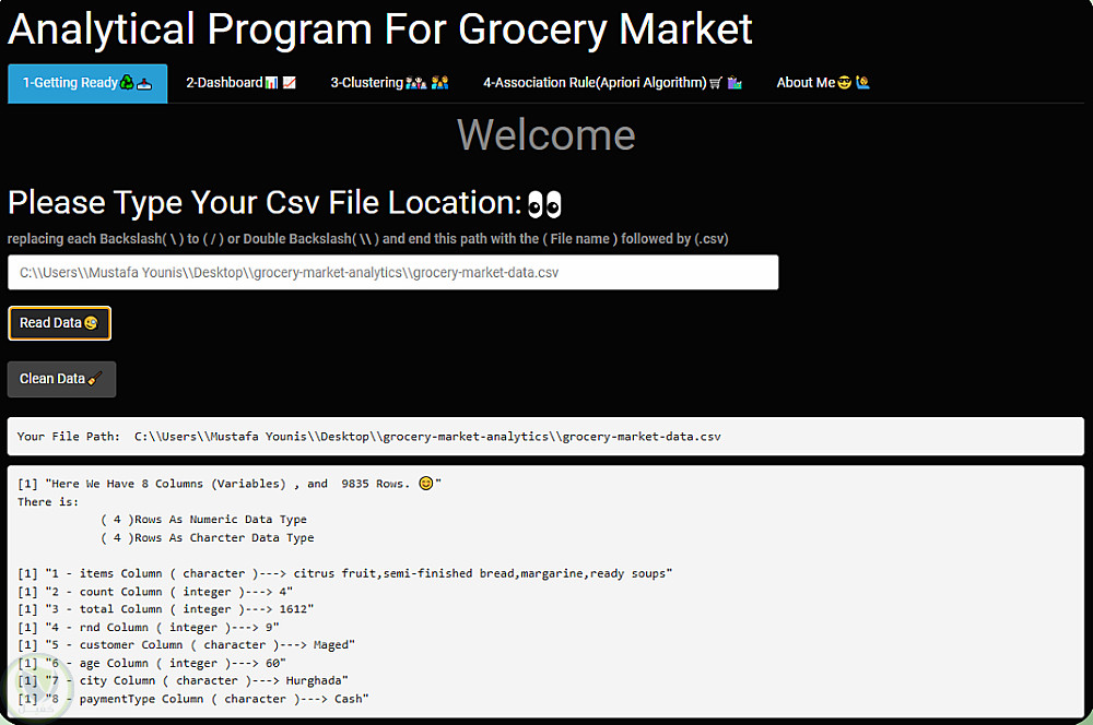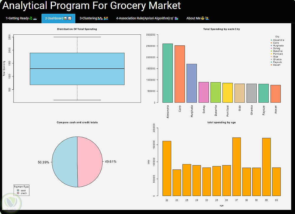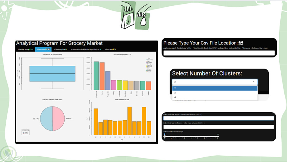 تطبيق تحليل بيانات سوق البقالة الذكي (Grocery Market Analytics System) هو نظام تفاعلي تم تطويره باستخدام لغة R وإطار عمل Shiny، يهدف إلى تحويل بيانات المبيعات الخام إلى رؤى تحليلية تساعد في فهم سلوك العملاء واتخاذ قرارات تجارية أفضل.