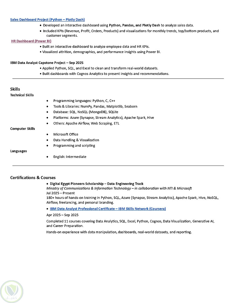 تحسين الـ CV ليستهدف مجالات Data Analysis / Data Engineering