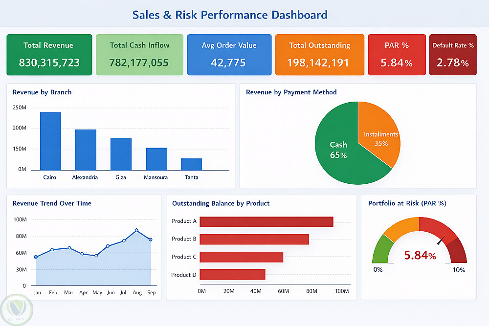 لوحة معلومات تفاعلية لتحليل أداء المبيعات والمخاطر، تعرض أهم مؤشرات الأداء مثل إجمالي الإيرادات، التدفقات النقدية، متوسط قيمة الطلب، الرصيد القائم، نسبة المخاطر (%PAR) ونسبة التعثر. كما تتضمن تحليلاً للإيرادات حسب الفروع وطرق الدفع، واتجاه المبيعات بمرور الوقت، والرصيد القائم حسب المنتج، مع عرض مرئي واضح يساعد على اتخاذ قرارات مبنية على البيانات.
