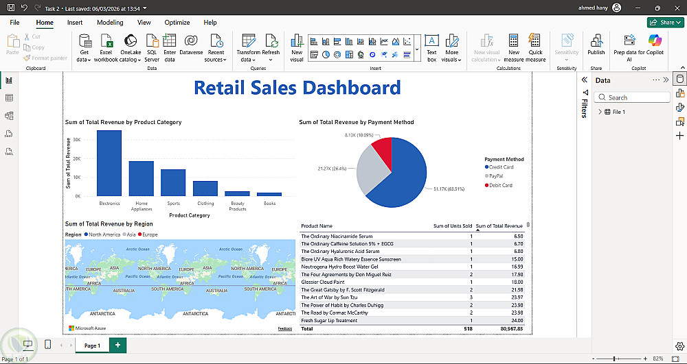 توفر هذه اللوحة نظرة شاملة على أداء مبيعات التجزئة، بما في ذلك إجمالي الإيرادات حسب فئة المنتجات، وتوزيع المبيعات جغرافيًا، وتحليل طرق الدفع. تساعد هذه البيانات الإدارة على فهم اتجاهات المبيعات وتقييم الأداء بشكل سريع وفعّال