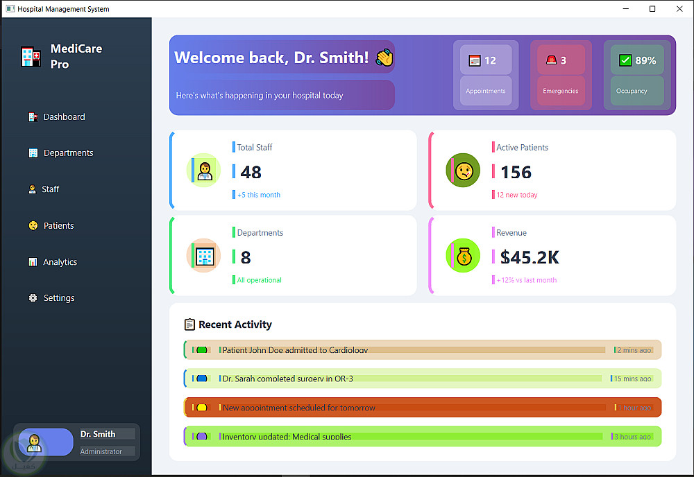 يوفر النظام لوحة تحكم (Dashboard) تعرض نظرة عامة سريعة مثل عدد الأقسام والمرضى والموظفين وحالة النظام، بالإضافة إلى عرض الأنشطة الأخيرة.