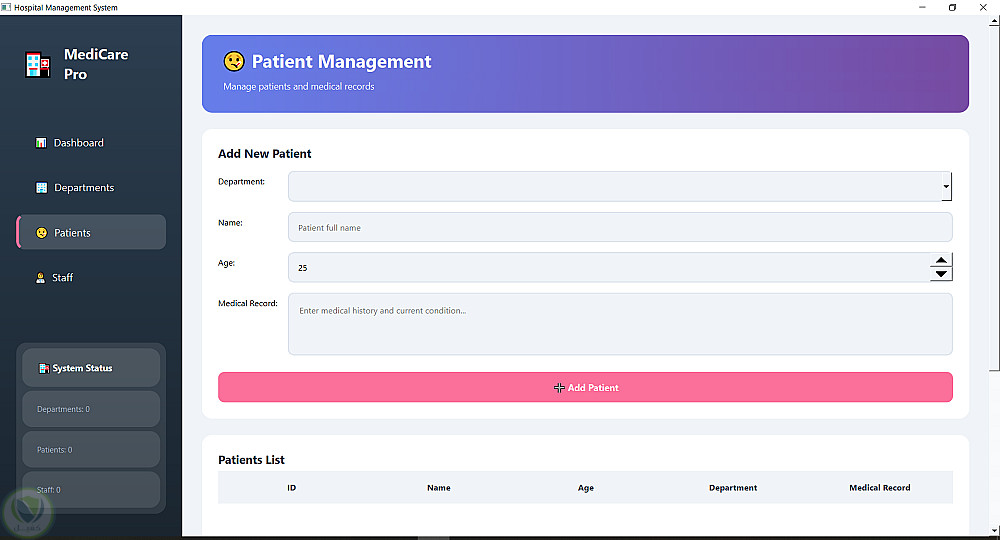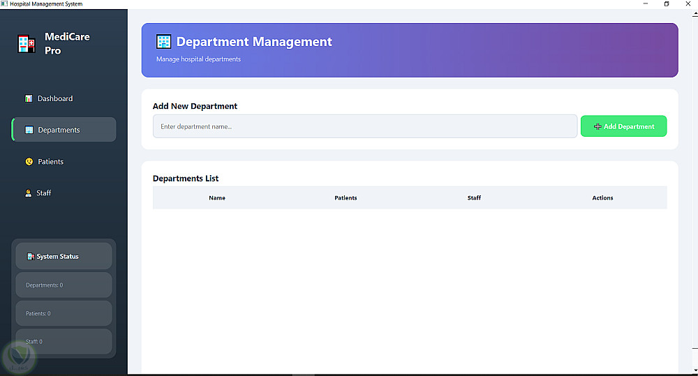 هذا المشروع هو نظام إدارة مستشفى تم تطويره كتطبيق سطح مكتب لتسهيل إدارة العمليات اليومية داخل المستشفى من خلال واجهة سهلة الاستخدام.